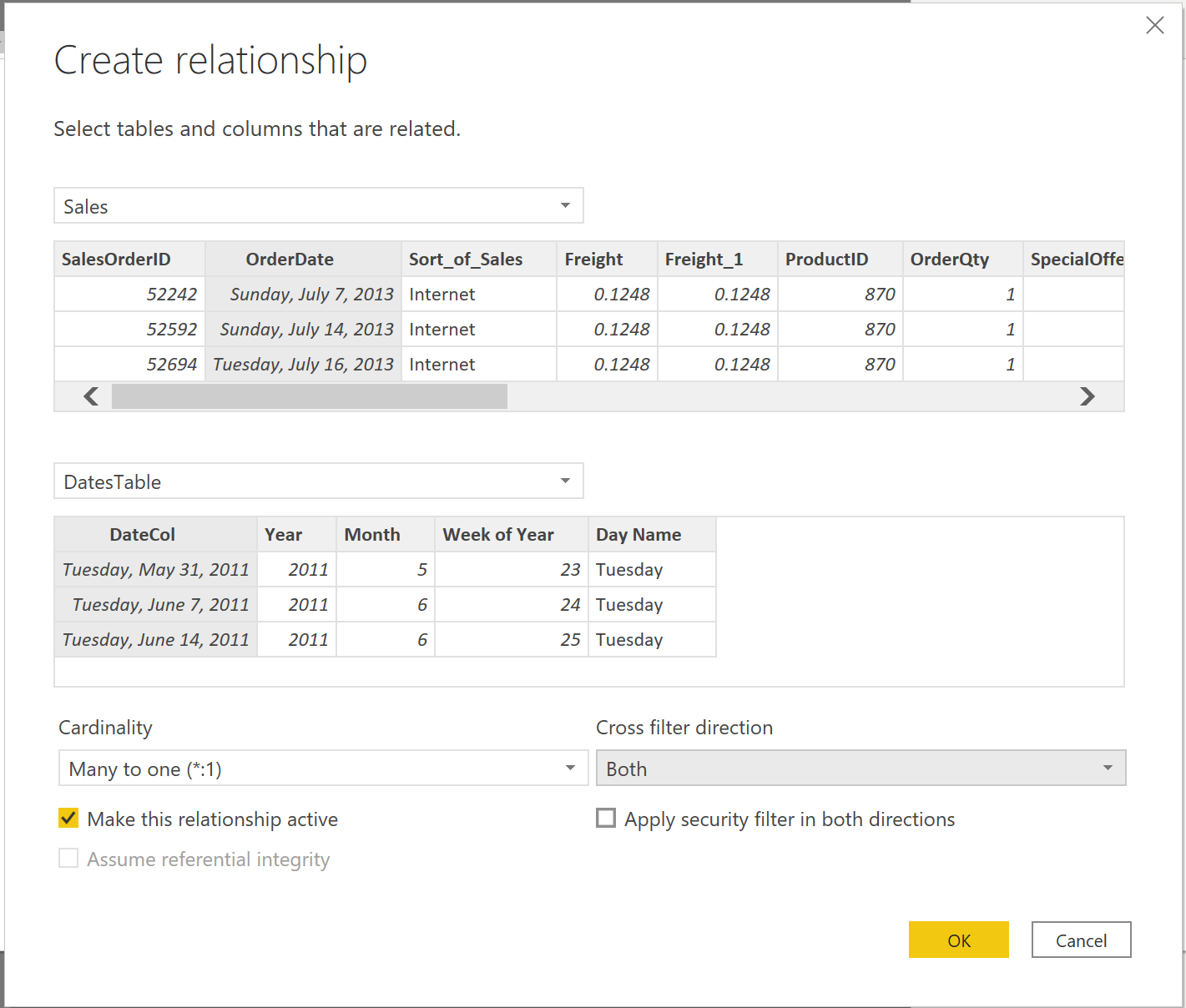 Hvis du vil opbygge grafik mellem tabellerne Salg og Ordrer, skal du oprette en relation mellem denne nye fælles datotabel og tabellerne Salgsordrer og Ordrer. Som følge heraf kan du opbygge visuelle elementer ved hjælp af den nye datotabel. Du kan udføre denne opgave > ved at gå til fanen Administrer relationer for model, hvor du kan oprette relationer mellem den fælles datotabel og tabellerne Ordrer og Salg ved hjælp af kolonnen OrderDate. Følgende skærmbillede viser et eksempel på en sådan relation.