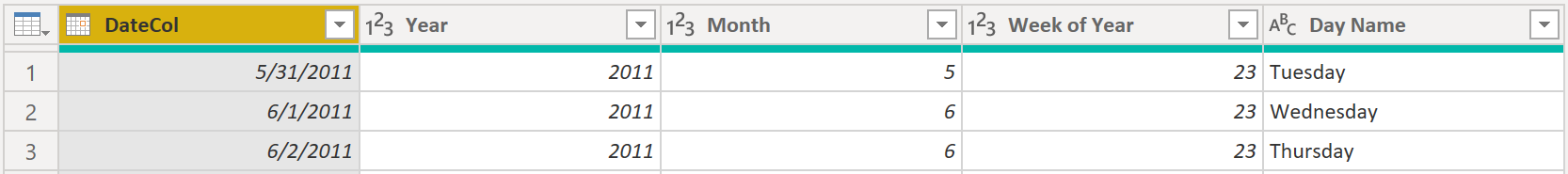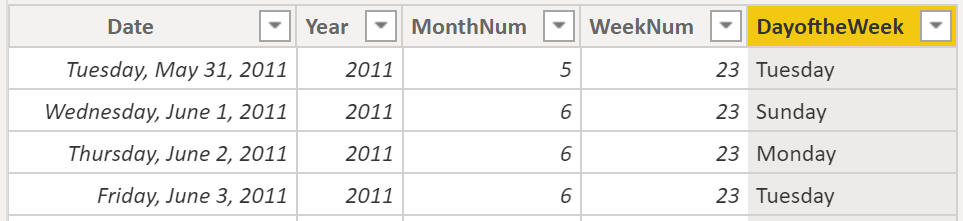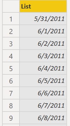 Dates = CALENDAR(DATE(2011, 5, 31), DATE(2022, 12, 31))
