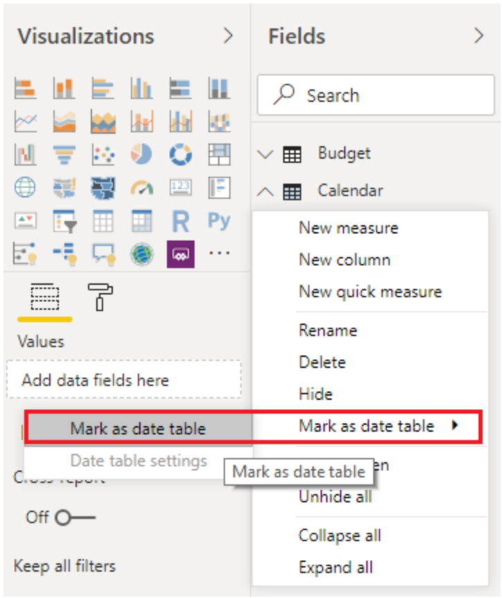 Den første opgave ved afmærkning af tabellen som den officielle datotabel er at finde den nye tabel i ruden Felter. Højreklik på navnet på tabellen, og vælg derefter Markér som datotabel som vist i følgende figur.