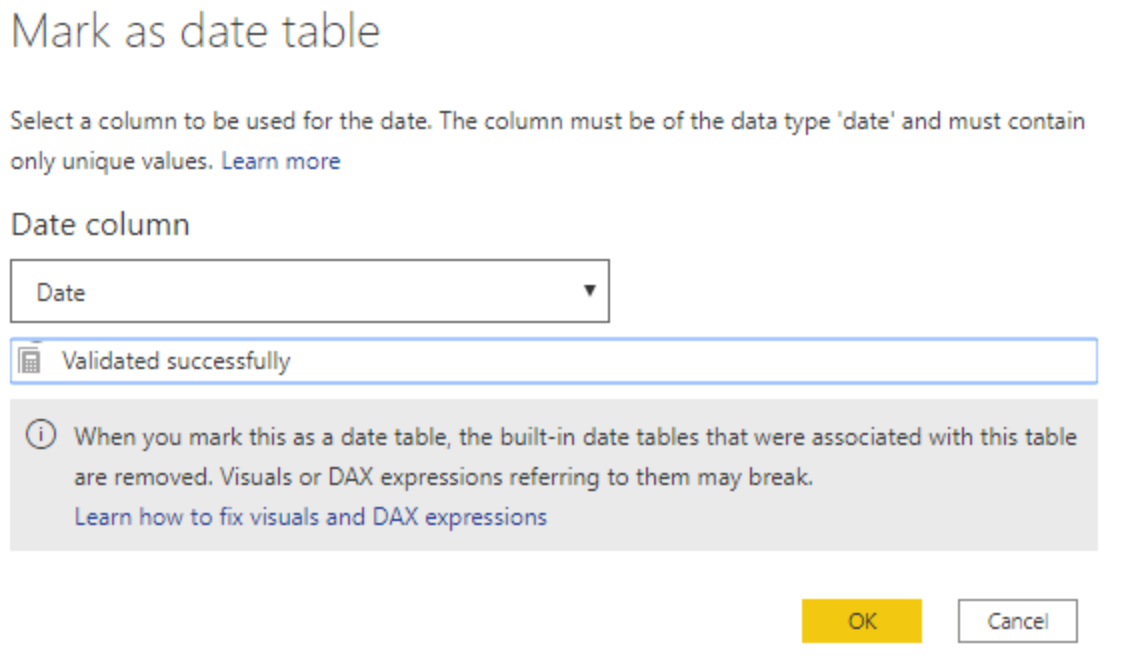 Når du markerer tabellen som en datotabel, Power BI udføres valideringer for at sikre, at data indeholder null-værdier på nul, er entydige og indeholder fortløbende datoværdier for en periode. Du kan også vælge bestemte kolonner i tabellen, der skal markeres som datoen, hvilket kan være nyttigt, når du har mange kolonner i tabellen. Højreklik på tabellen, vælg Marker som datotabel, og vælg derefter indstillinger for datotabel. Følgende vindue vises, hvor du kan vælge, hvilken kolonne der skal markeres som Dato.
