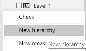 Nu kan du oprette et hierarki i ruden Felter, som du tidligere har gjort det. Højreklik på Niveau 1, da dette er det første hierarkiniveau, og vælg derefter Nyt hierarki. Træk og slip derefter niveau 2 og niveau 3 til dette hierarki.
