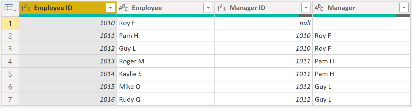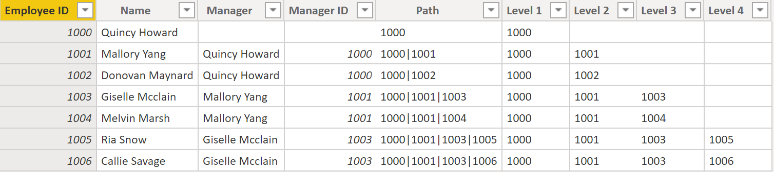 Når du er færdig, kan du se, at du nu har alle hierarkiets niveauer i din tabel. Roy F er øverst i hierarkiet, og når du gennemgår niveau 2-3, kan du se, at lederne og medarbejderne er tilknyttet hinanden.
