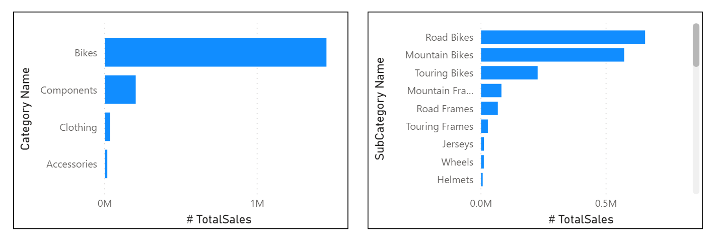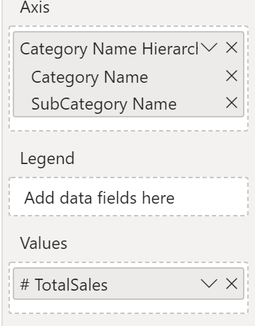 Du kan foretage detailudledning i visual'et for at få vist både Category og Subcategory, afhængigt af hvad du vil se. Hierarkier giver dig mulighed for at få vist stigende dataniveauer i en enkelt visning.