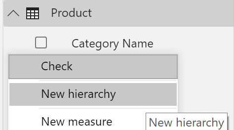 Du kan f. eks. forestille dig en situation, hvor du vil oprette et stablet liggende søjlediagram med det samlede salg efter kategori og underkategori. Du kan udføre denne opgave ved at oprette et hierarki i tabellen Product for kategorier og underkategorier. Hvis du vil oprette et hierarki, skal du gå til ruden Felter i Power BI og derefter højreklikke på den kolonne, du vil oprette hierarkiet for. Vælg Nyt hierarki som vist i følgende figur.