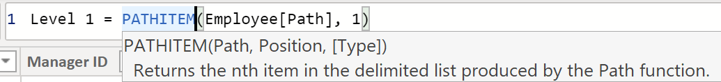 - Niveau 1 = PATHITEM(Employee[Path],1)