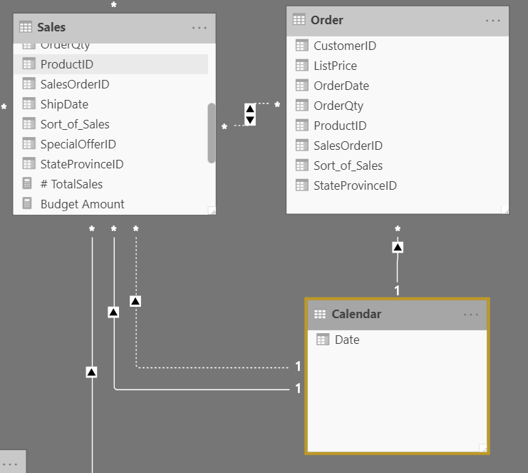 I det foregående visual vises tabellerne Calendar, Sales og Orders. Calendar er dimensionstabellen, mens Sales og Orders er faktatabeller. Dimensionstabellen har to relationer: én med Sales og én med Orders. Dette eksempel viser en dimension med forskellige roller, fordi tabellen Calendar kan bruges til at gruppere data i både Sales og Orders. Hvis du vil oprette en visualisering, hvor tabellen Calendar refererer til tabellerne Orders og Sales, fungerer tabellen Kalender som en dimension med forskellige roller.