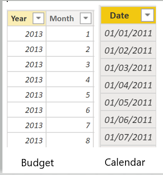 Nu kan du oprette en relation mellem tabellerne Budget og Calendar.