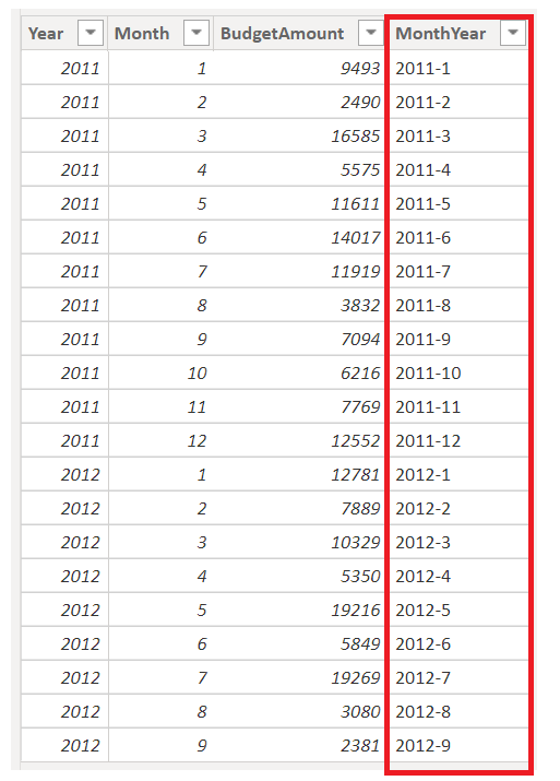 Som vist i den foregående figur, mangler der en relation mellem Budget og Calendar. Derfor skal du oprette denne relation, før du kan oprette visual'et. Bemærk, at hvis du transformerer kolonnerne Year og Month i tabellen Calendar til en ny kolonne og udfører den samme transformation i tabellen Budget, kan du matche formatet for kolonnen Date i tabellen Calendar. Derefter kan du oprette en relation mellem de to kolonner. Hvis du vil fuldføre denne opgave, skal du sammenkæde kolonnerne Year og Month og derefter ændre formatet.