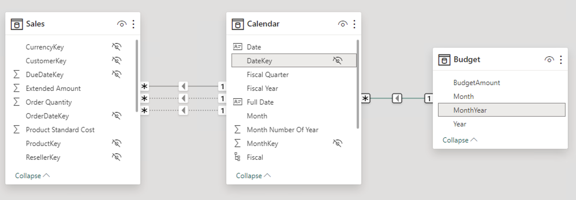 Forestil dig f.eks., at du opretter rapporter til salgsteamet hos Tailwind Traders. Du er blevet bedt om at oprette en matrix med det samlede salg og budget over tid ved hjælp af tabellerne Calendar, Sales og Budget. Du kan se, at det laveste niveau af tidsbaserede detaljer, der vises i tabellen Sales, er dage, f.eks. 5/1/2020, 6/7/2020 og 6/18/2020. Budgettabellen går f.eks. kun til det månedlige niveau, f.eks. er budgetdataene 5/2020 og 6/2020. Disse tabeller har forskellige granulariteter, der skal afstemmes, før du kan oprette en relation mellem tabeller.