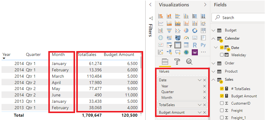 Vælg tabelvisualiseringen i ruden Visualisering , og angiv derefter disse målinger og dato i feltet Værdier . Du har nu nået målet om at oprette en matrix over det samlede salg og budgetter over tid.