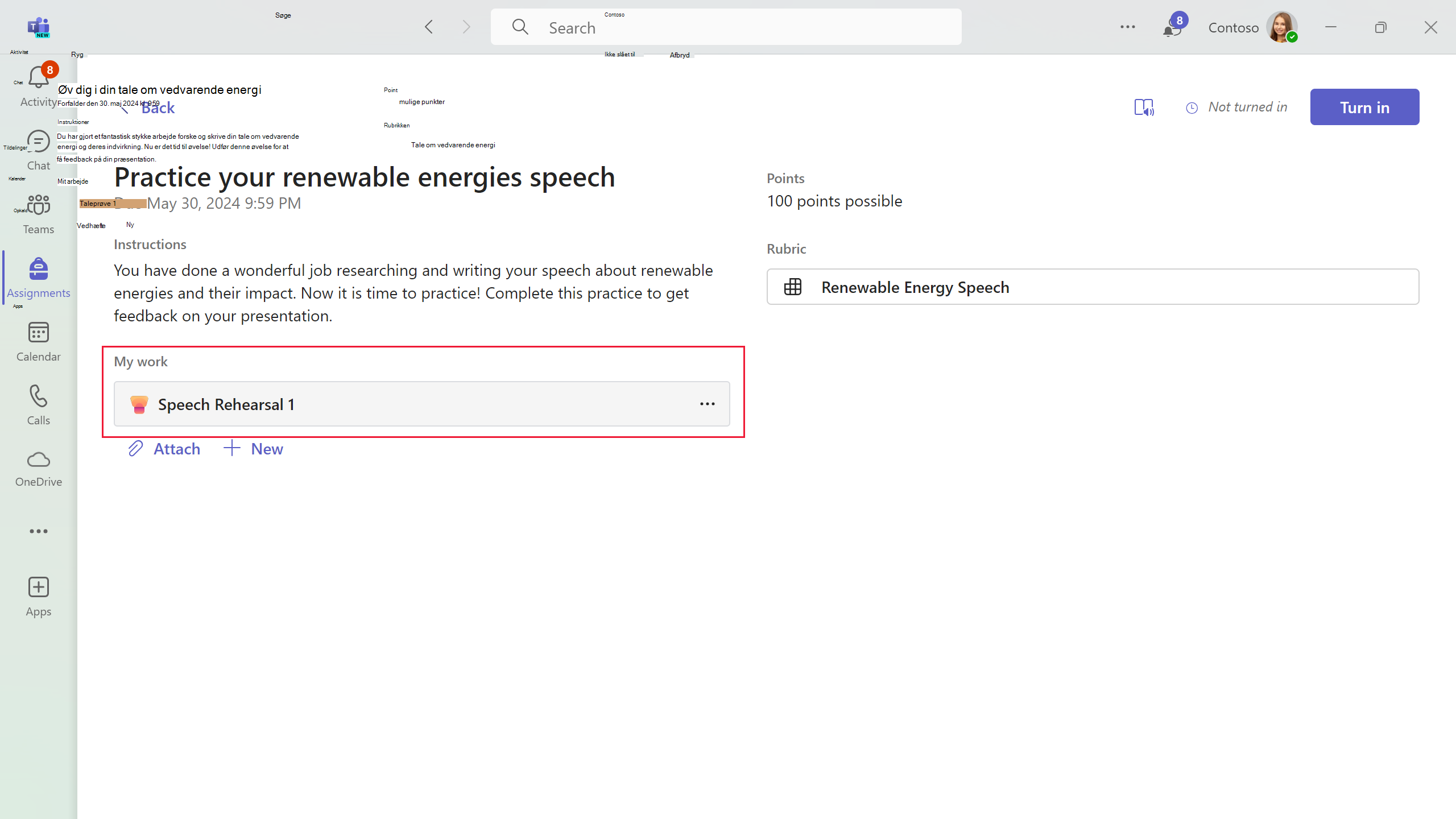 Når de er klar, vedhæfter eleverne deres optagelse til deres opgave. Når de vedhæfter optagelsen, kan de aflevere afprøvningen fra tildelingssiden i Teams.