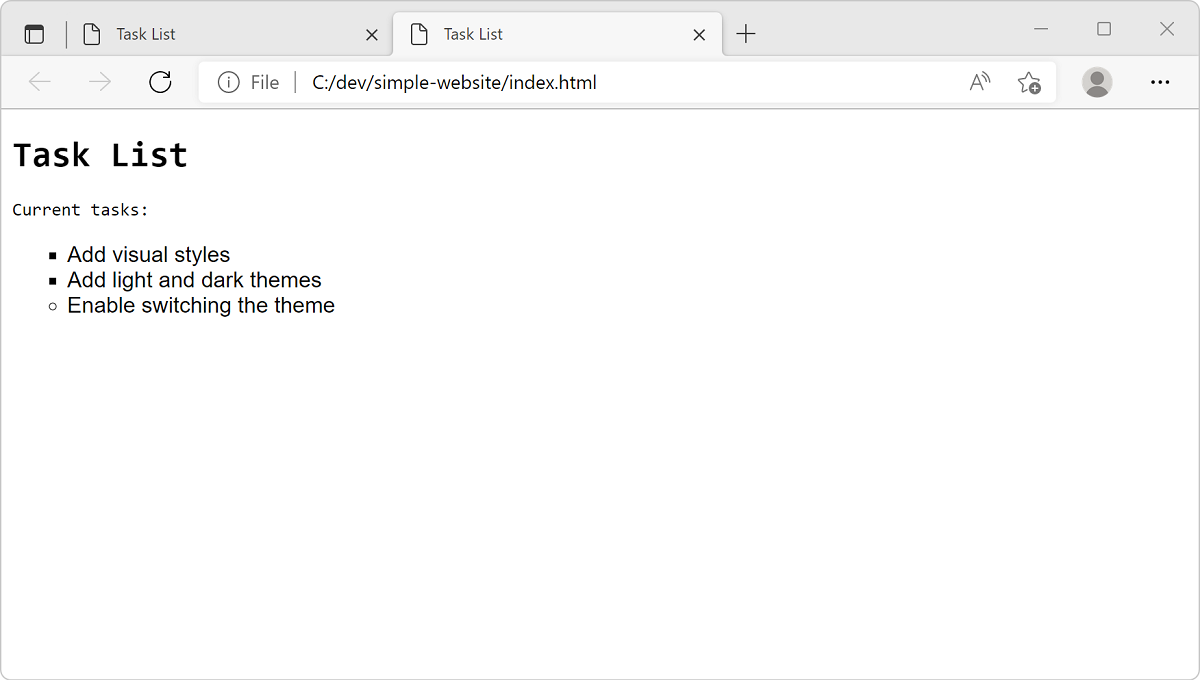 main.css-filen, skal du vælge denindex.htmlfil for at få vist ændringerne.Websiden åbnes i standardbrowseren.