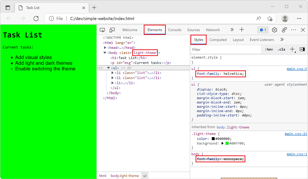 index.html-elementet med klassenavnet<body>i HTML-filen (light-theme). Nu anvender klassevælgeren til lyst tema typografierne korrekt.<body class="light-theme">