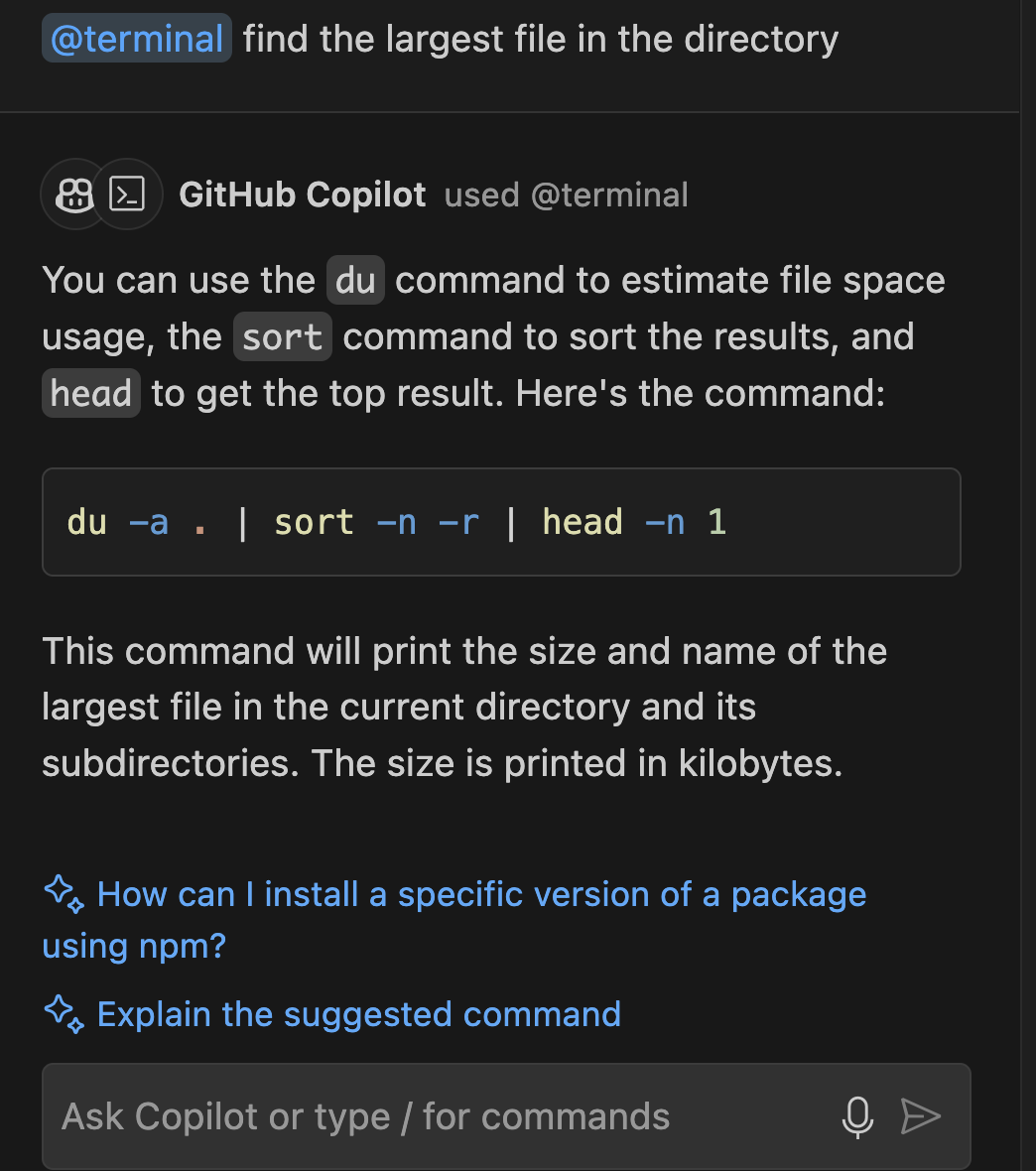 @terminal: Denne agent er nyttig til kommandolinjerelaterede spørgsmål. Du kan f.eks. bede den om at finde den største fil i en mappe eller forklare den sidste kommando, du kørte.