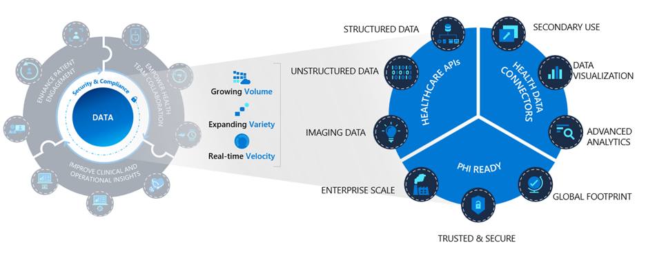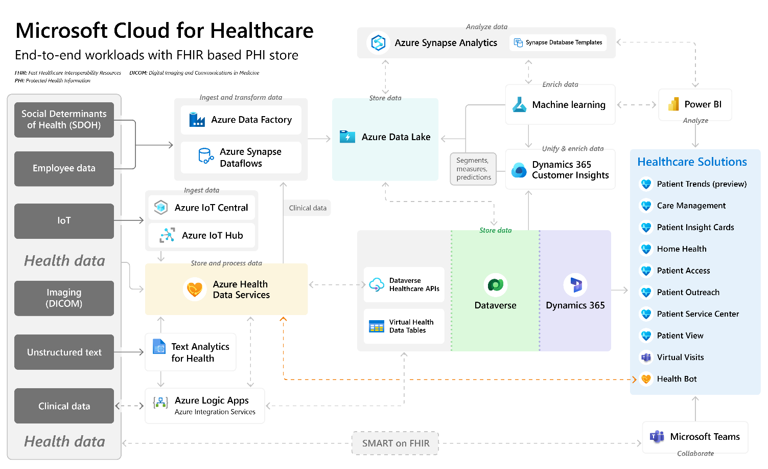 Azure Health Data Services - A managed platform-as-a service (PaaS), which is a set of tools and connectors that enable organizations to ingest health data to the Microsoft Cloud for improved health through insights. Healthcare organizations can benefit from using a set of application programming interface (API) services and frameworks that are dedicated to the healthcare industry because health data can be fragmented across multiple systems, device types, and data formats. To improve the overall wellness, from population health to personalized care, healthcare industries require a centralized platform for collecting insights from health data. By using Azure Health Data Services as a compliant solution where different types of health data are harmonized together, organizations can de-identify protected health information (PHI) and can connect to the machine learning and data analytics resources in the greater Microsoft Azure ecosystem. Azure Health Data Services focuses on several internationally adopted data standards, including Fast Healthcare Interoperability Resources (FHIR) and Digital Imaging and Communications in Medicine (DICOM). For more information, see Get started with Azure Health Data Services.