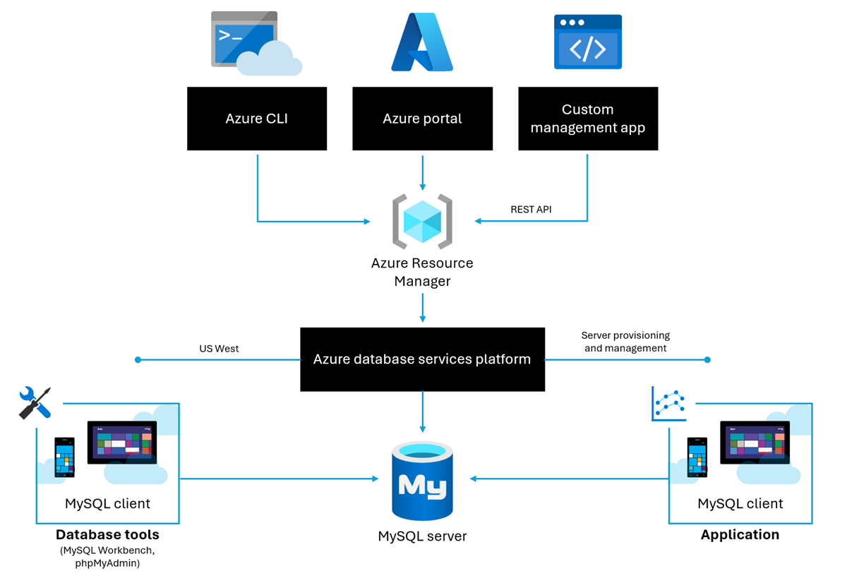 De fleste cloudarkitekter og -udviklere ønsker ikke at administrere den server, der hoster deres apps eller det underliggende operativsystem (OS) og database. I stedet vil de fokusere på at udvikle deres clouddesignede apps. Brug af Microsoft Azure Database til MySQL kan hjælpe dem med at opnå dette fokus. Azure Database til MySQL er en administreret relationsdatabase som en tjeneste (DBaaS), der kan hjælpe med at administrere dine missionskritiske arbejdsbelastninger med forudsigelig ydeevne og dynamisk skalerbarhed. Du kan knytte dine eksisterende klientapps og databaseværktøjer til din Azure Database til MySQL-forekomst for at få fordelene ved et PaaS-miljø (platform as a service), som vist på følgende billede.