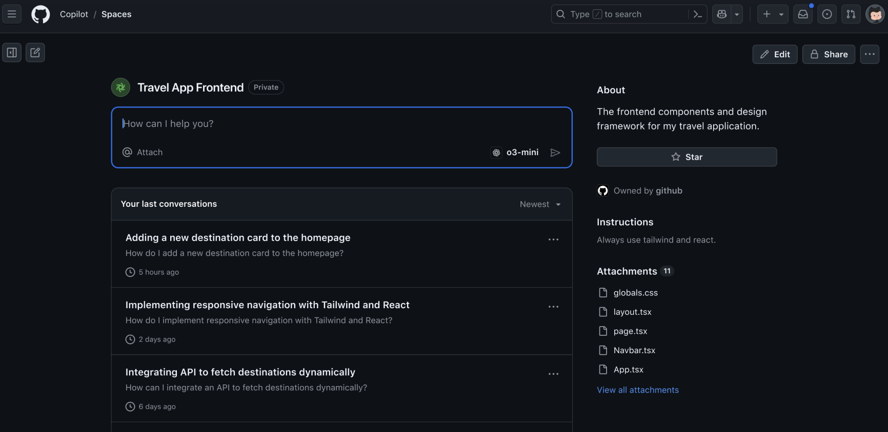 Det er en dedikeret Copilot-chat, der er baseret på et kurateret sæt kontekst, du vælger. Rummet er i sig selv som en LLM, og du kan fodre det med GitHub-filer, problemer, pull-anmodninger og dine egne fritekstinstruktioner for at give kontekst til dit specifikke emne.