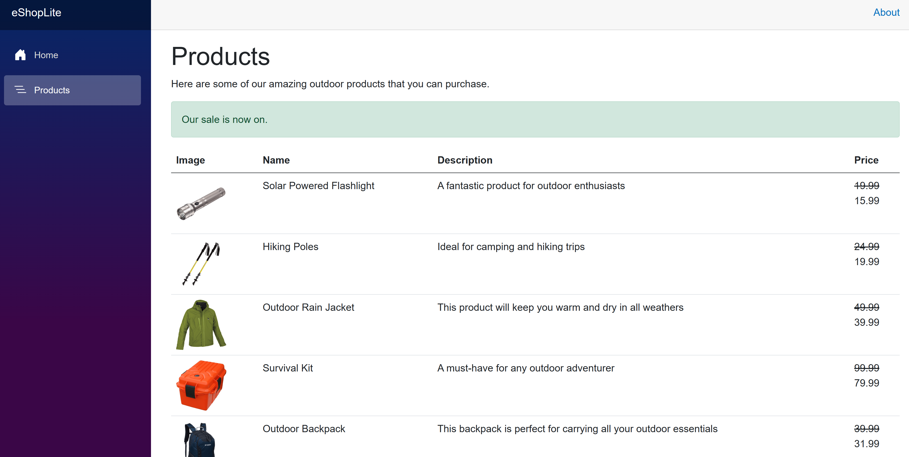 protected override async Task OnInitializedAsync() { saleOn = await FeatureManager.IsEnabledAsync("SeasonalDiscount"); // Simulate asynchronous loading to demonstrate streaming rendering products = await ProductService.GetProducts(); if (saleOn) { discountPercentage = Convert.ToDecimal(Configuration.GetSection("eShopLite__Store__DiscountPercent").Value); } }Ovenstående kode bruger konfigurationsobjektet til at hente værdien af konfigurationsindstillingen. Værdien gemmes i variablen