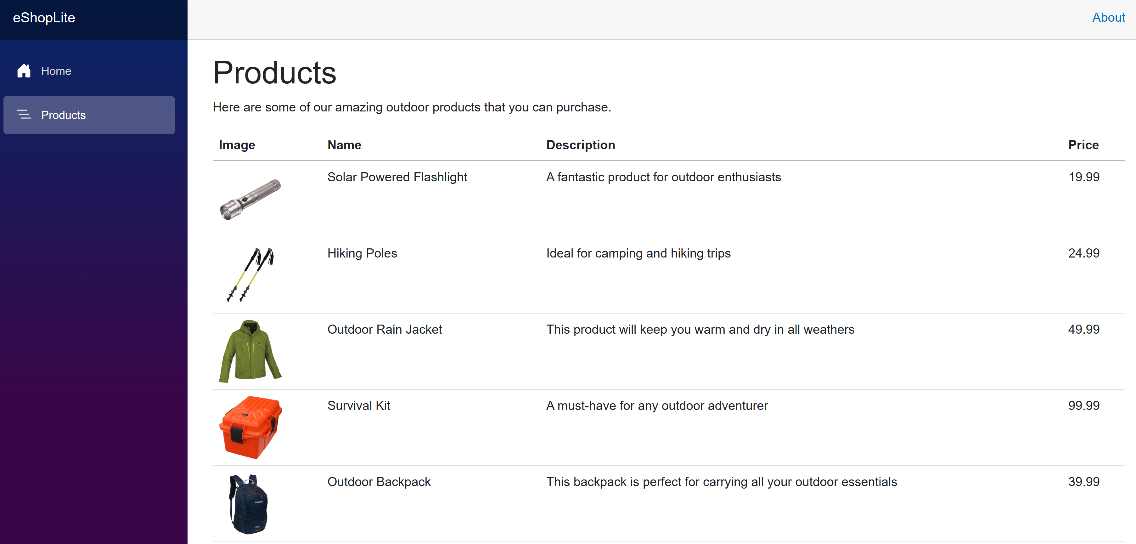 Hvis du bruger Visual Studio Code lokalt, skal du åbne http://localhost:32000/products.