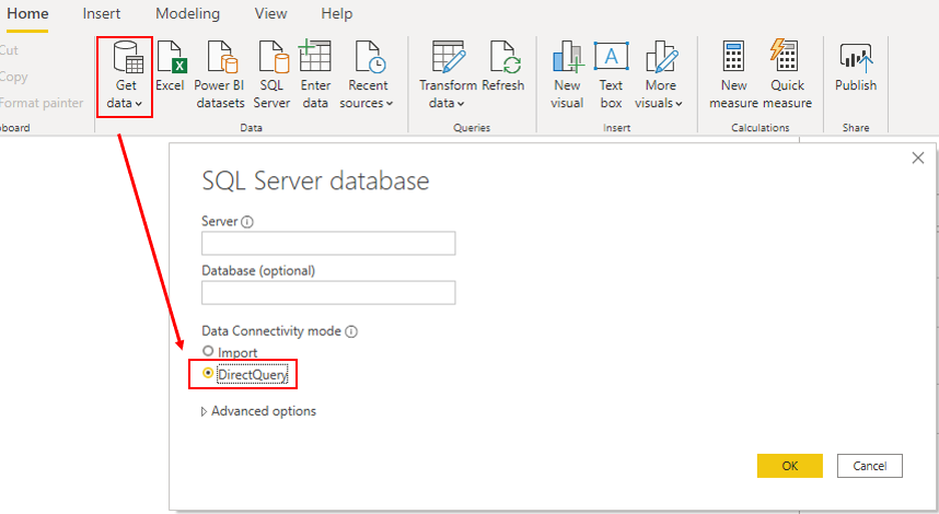 DirectQuery er en måde at hente data på Power BI Desktop. DirectQuery-metoden involverer direkte forbindelse til data i dets kildelager inde fra Power BI Desktop. Den er et alternativ til at importere data til Power BI Desktop.