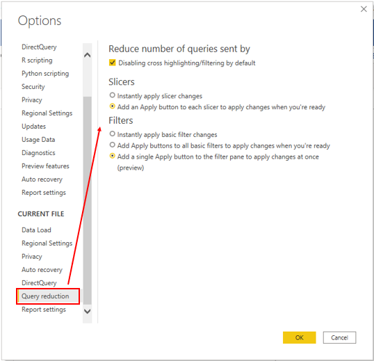 Power BI Desktop giver dig mulighed for at sende færre forespørgsler og deaktivere visse interaktioner, der vil resultere i en dårlig erfaring, hvis det tager lang tid at køre de forespørgsel, der er resultatet. Hvis du anvender disse indstillinger, forhindres det, at forespørgsler fortløbende søger i datakilden, hvilket bør forbedre ydeevnen.