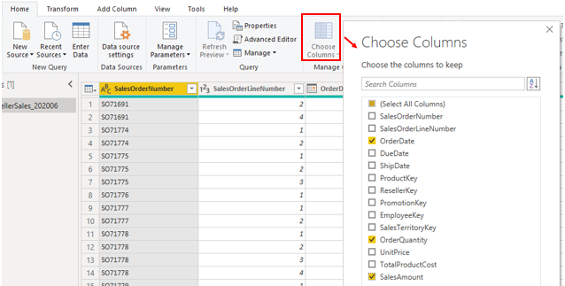 Du vil samle dataene efter kolonnen OrderDate og have vist kolonnerne OrderQuantity og SalesAmount. Start med at vælge Vælg kolonner under fanen Hjem. I det viste vindue skal du vælge de kolonner, du vil have i sammenlægningen, og derefter vælge OK.