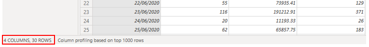 Vælg knappen Luk og Anvend for at lukke Power Query-editor og anvende ændringerne på din semantiske model. Vend tilbage til siden Power BI Desktop, og vælg derefter knappen Opdater for at se resultaterne. Se skærmen, fordi der vises en kort meddelelse om antallet af rækker, som din semantiske model nu har. Dette antal rækker bør være markant mindre end det antal, du startede med. Du kan også se dette antal, når du åbner Power Query-editor igen, som vist på følgende skærmbillede. I dette eksempel blev antallet af rækker reduceret til 30.