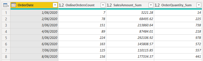Det kan tage et par minutter, før sammenlægningen vises, men når det sker, kan du se, hvordan dataene er blevet transformeret. Dataene samles i hver dato, og du kan se værdierne for antallet af ordrer og den respektive sum af salgsbeløbet og ordreantallet.