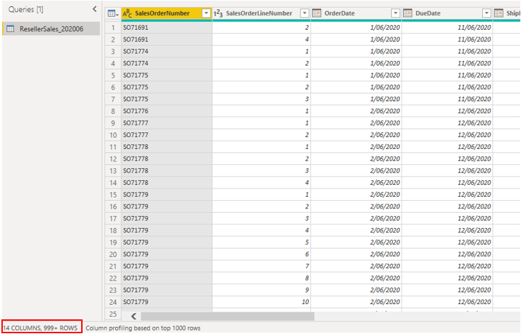 I dette eksempel åbner du en forespørgsel i Power Query-editor og bemærker, at dataene ikke er blevet samlet. Der er over 999 rækker, som vist på følgende skærmbillede.