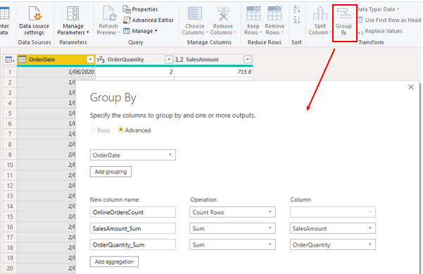 Når de valgte kolonner vises på siden, skal du vælge indstillingen Gruppér efter under fanen Hjem. I det viste vindue skal du vælge den kolonne, du vil gruppere efter (OrderDate), og angive navnet på den nye kolonne (OnlineOrdersCount).