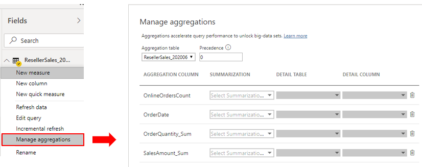 Når du samler data, opsummerer du disse data og viser dem med en lavere detaljeringsgrad (på et højere niveau). Du kan f.eks. opsummere alle salgsdata og gruppere dem efter dato, kunde, produkt osv. Sammenlægningsprocessen reducerer tabelstørrelserne i den semantiske model, så du kan fokusere på vigtige data og hjælpe med at forbedre forespørgselsydeevnen.