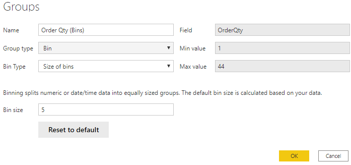 I dette eksempel skal du oprette bins (grupper) for feltet Ordreantal. Start med at gå til ruden Felter, højreklik på det felt med Ordreantal, hvor du vil oprette bins, og vælg derefter Ny gruppe. I vinduet Grupper, som vises, skal du angive Grupperingsstørrelse til den ønskede størrelse og tilpasse de øvrige indstillinger efter behov. Vælg derefter OK.