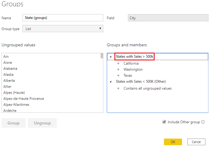 I vinduet Grupper, som vises, kan du se en liste over grupperne og de forskellige elementer, som de indeholder. På følgende billede kan du se gruppen States with Sales > 500k og dens medlemmer samt gruppen Andet (Stater med salg < 500.000), der indeholder alle andre værdier, der ikke er blevet placeret i den første gruppe. Hvis du opdaterer dine data, og der vises nye elementer på listen med ikke-grupperede værdier, placeres de i gruppen Andet.