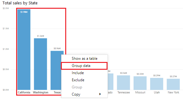 Opret gruppen ved at bruge Ctrl + klik til at vælge datapunkterne på det visuelle element, du vil gruppere. I dette tilfælde er det stater med salg på mere end 500.000 dollars. Højreklik på et af de valgte datapunkter, og vælg indstillingen Gruppedata.