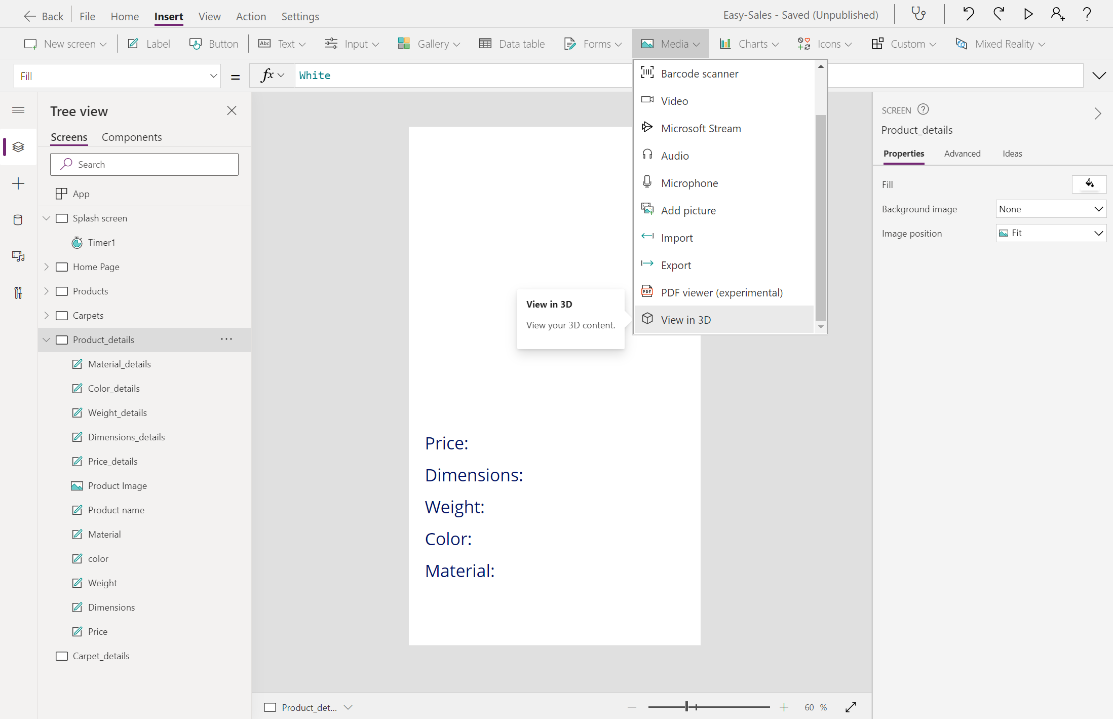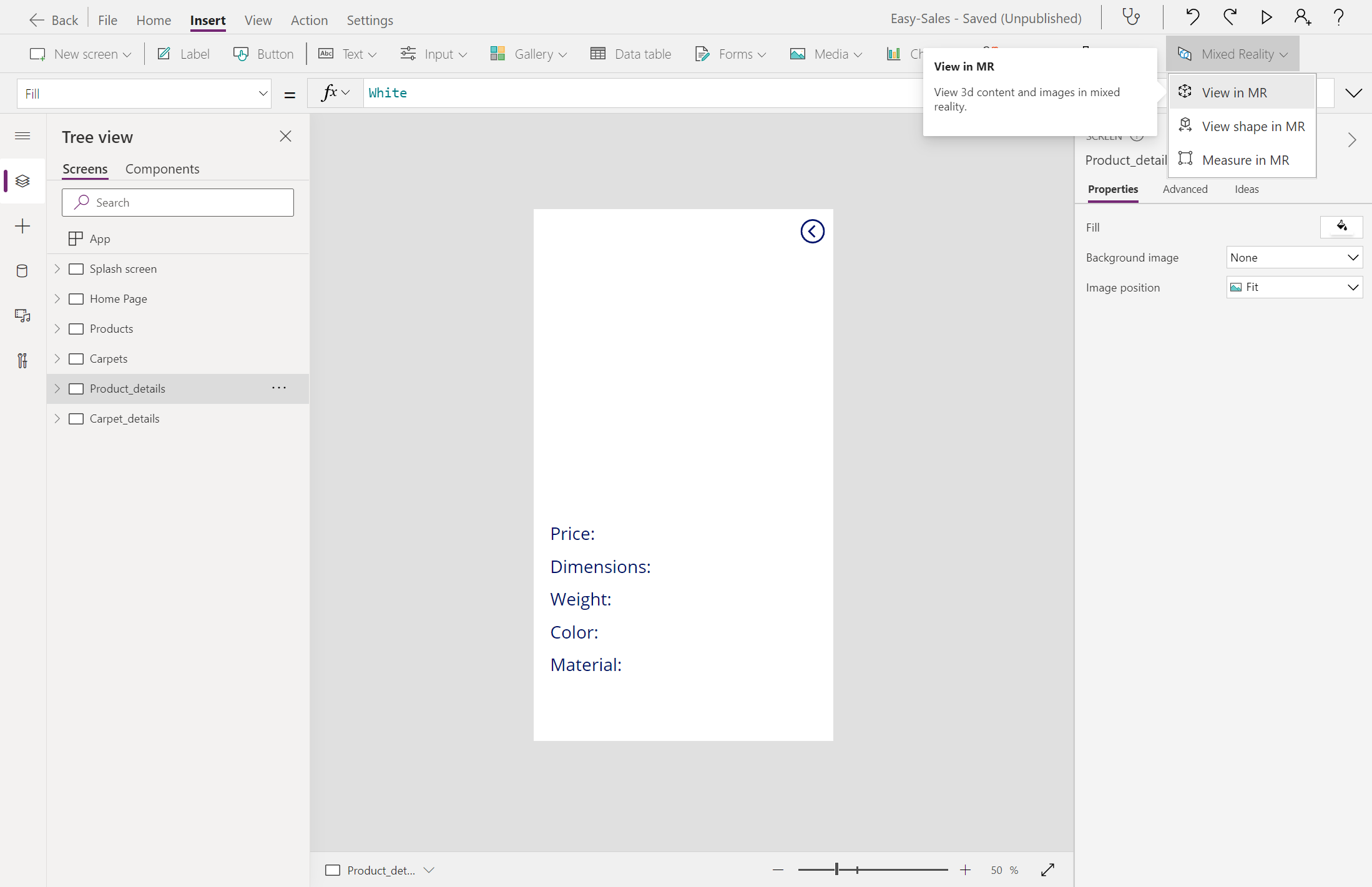 Føj komponenten visning i MR- til Product_details-skærmen. Åbn fanen Insert, udvid derefter rullelisten Mixed Reality, og vælg derefter komponenten View i MR.