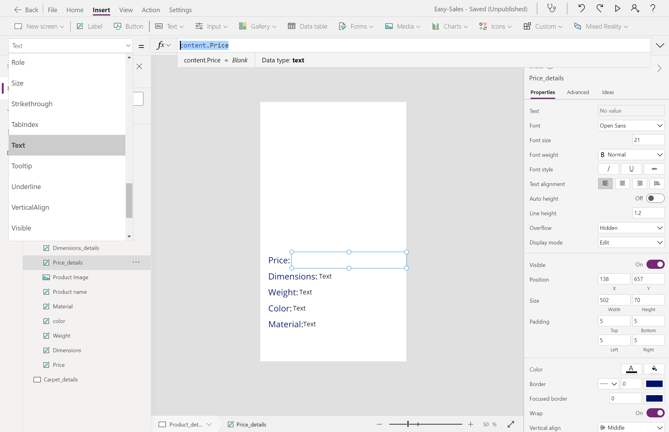 Navigate(Product_details,ScreenTransition.Cover,{content : ThisItem})Navigate(Carpet_details,ScreenTransition.Cover,{content_carpets : ThisItem})Lad os begynde at oprette siden med Product_details ved at tilføje nogle mærkater, f.eks. Price, Dimensions, Weight, Colorog Material. Du kan redigere teksten i etiketten ved at indsætte den ønskede tekst i egenskaben Text for den Label. Omdøb de navne i overensstemmelse hermed.