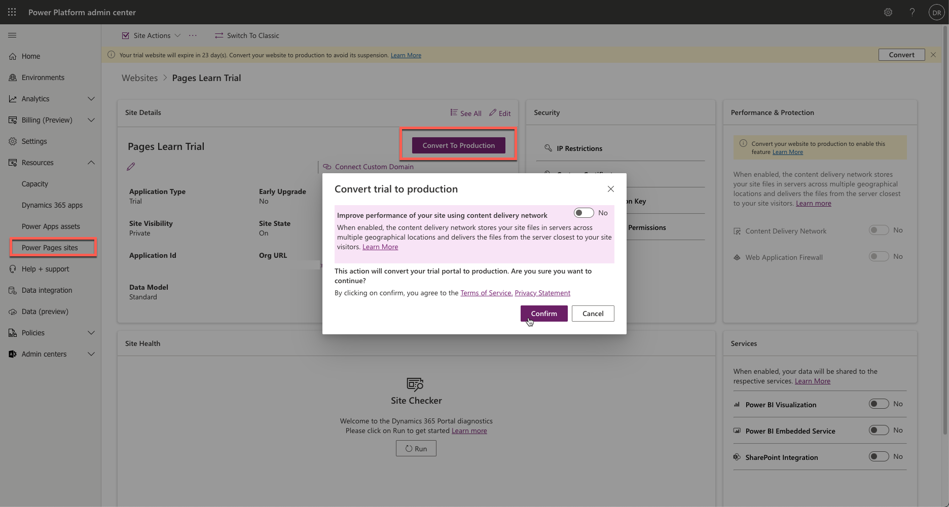 You can convert a trial to a production website from the Power Platform admin center.