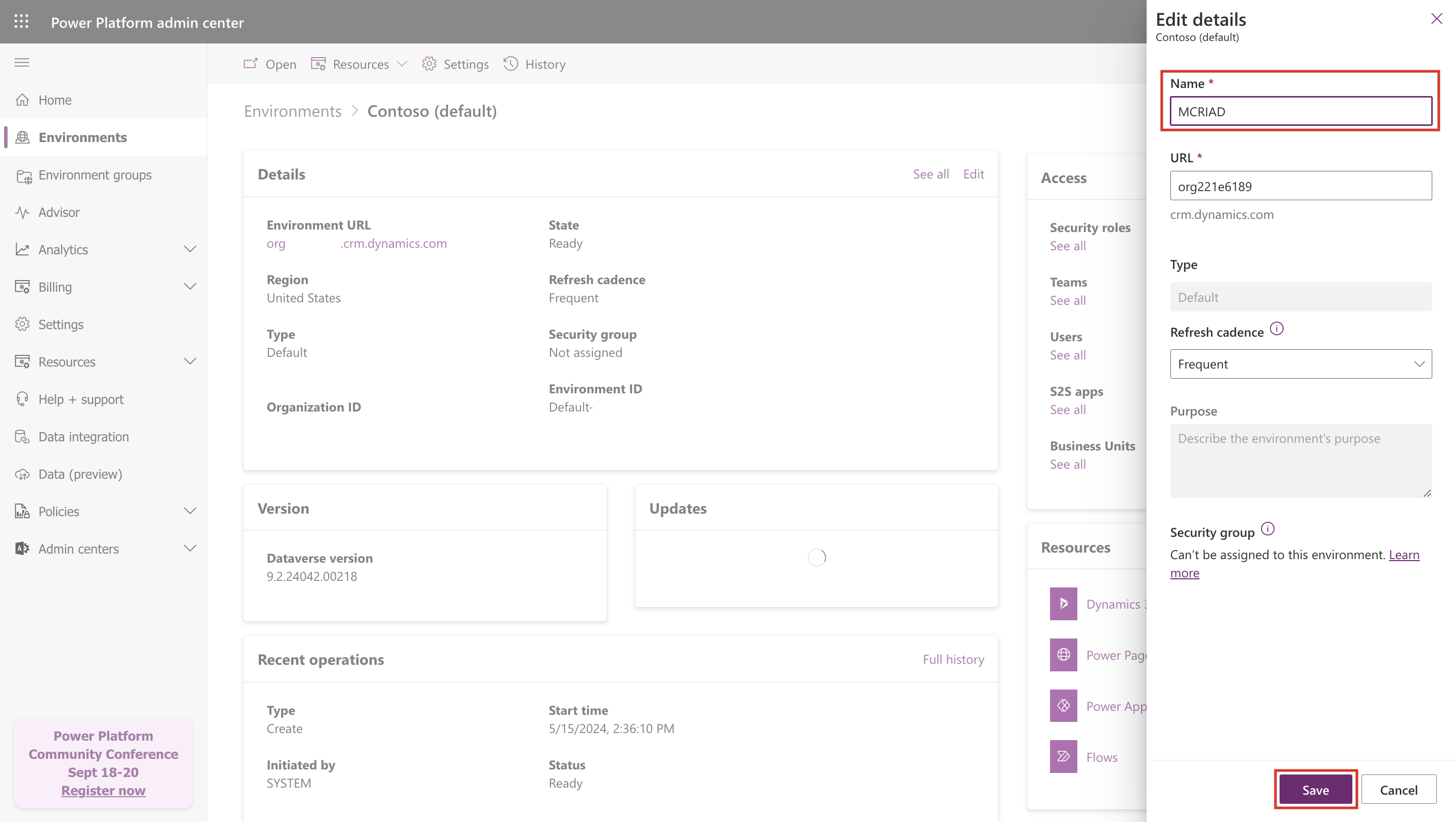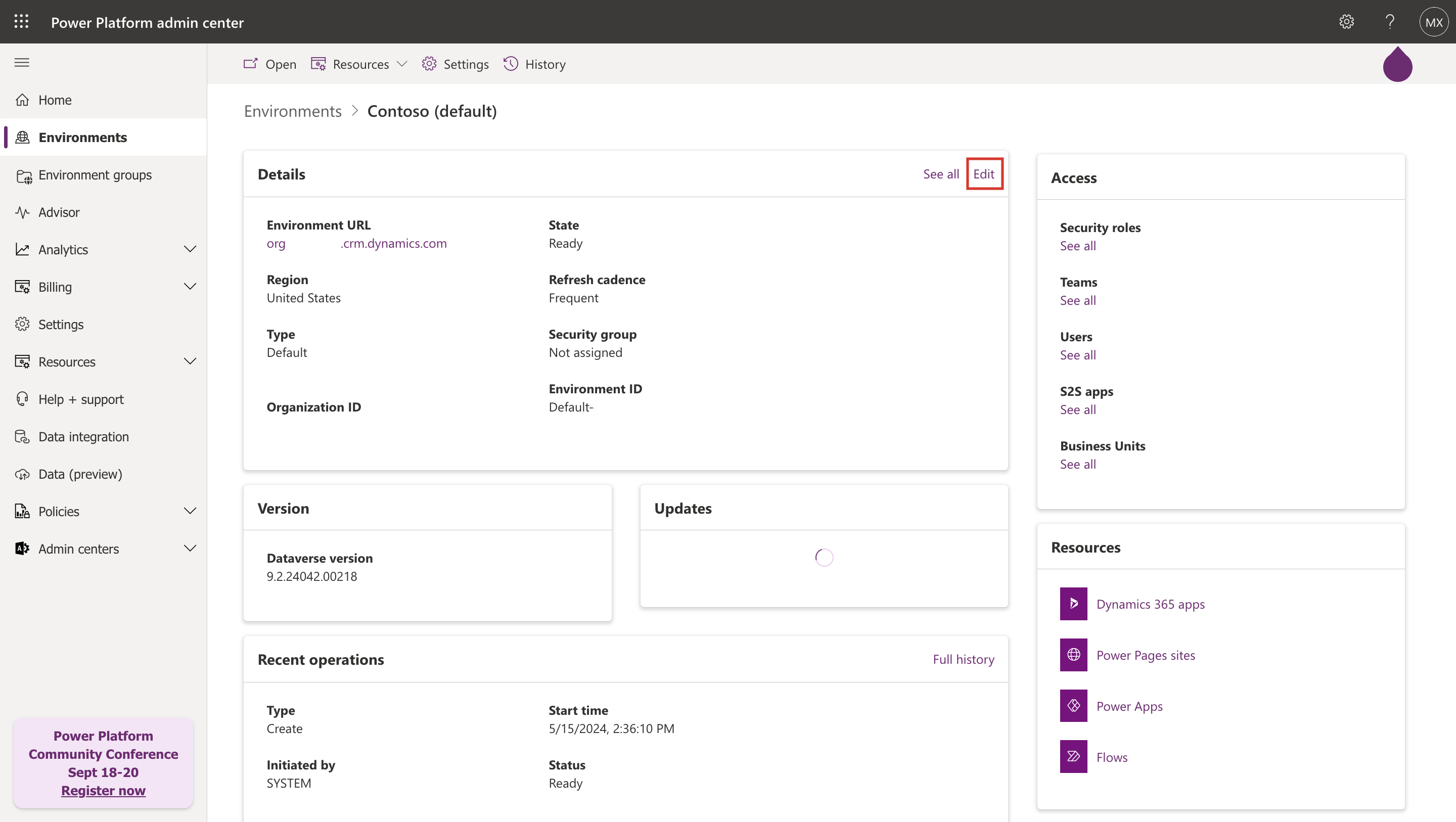 On the environment information page, select Edit.
