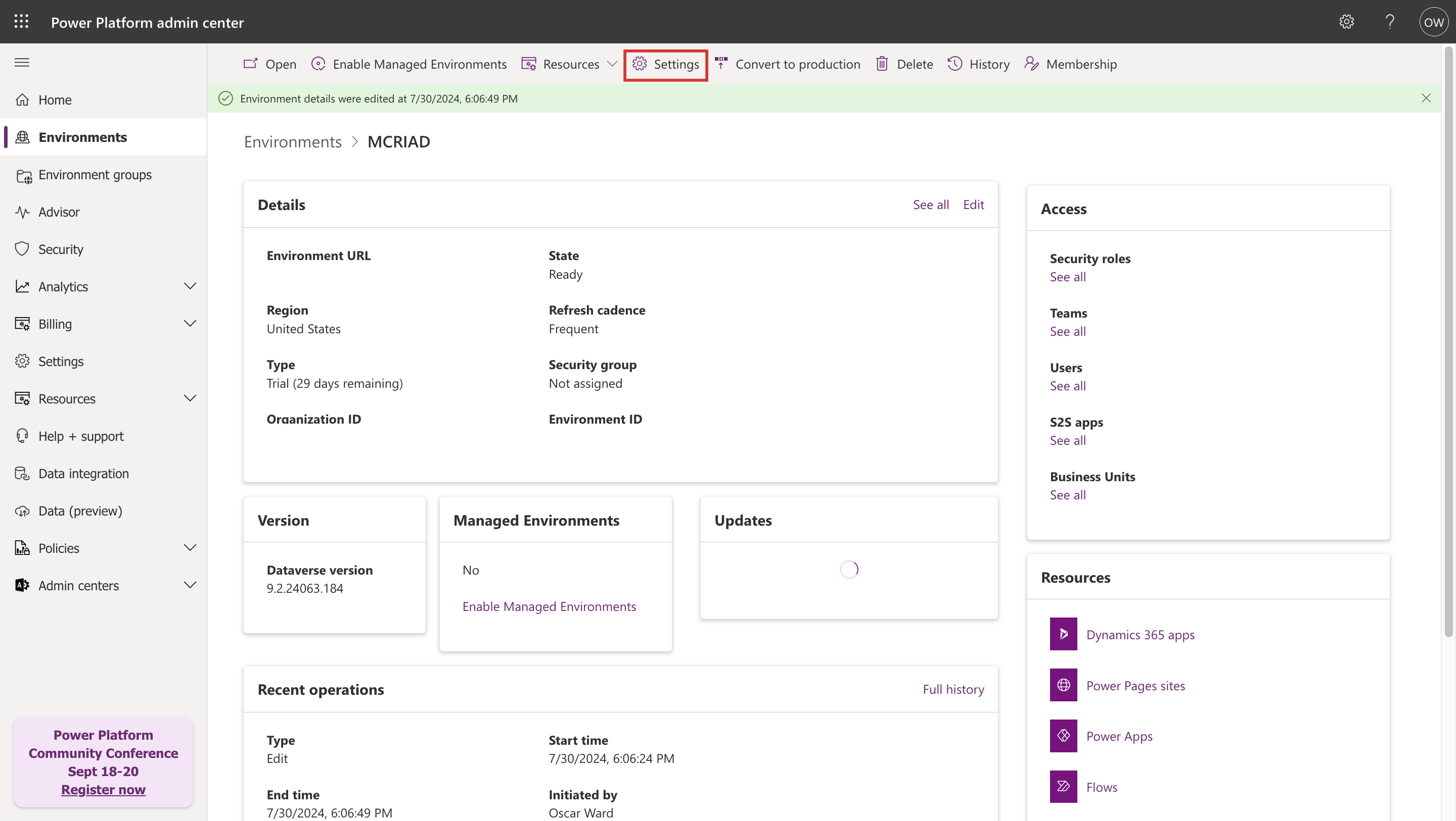 Sign in as Oscar Ward in Environments | Power Platform admin center (microsoft.com) and then select the Contoso (default) environment.