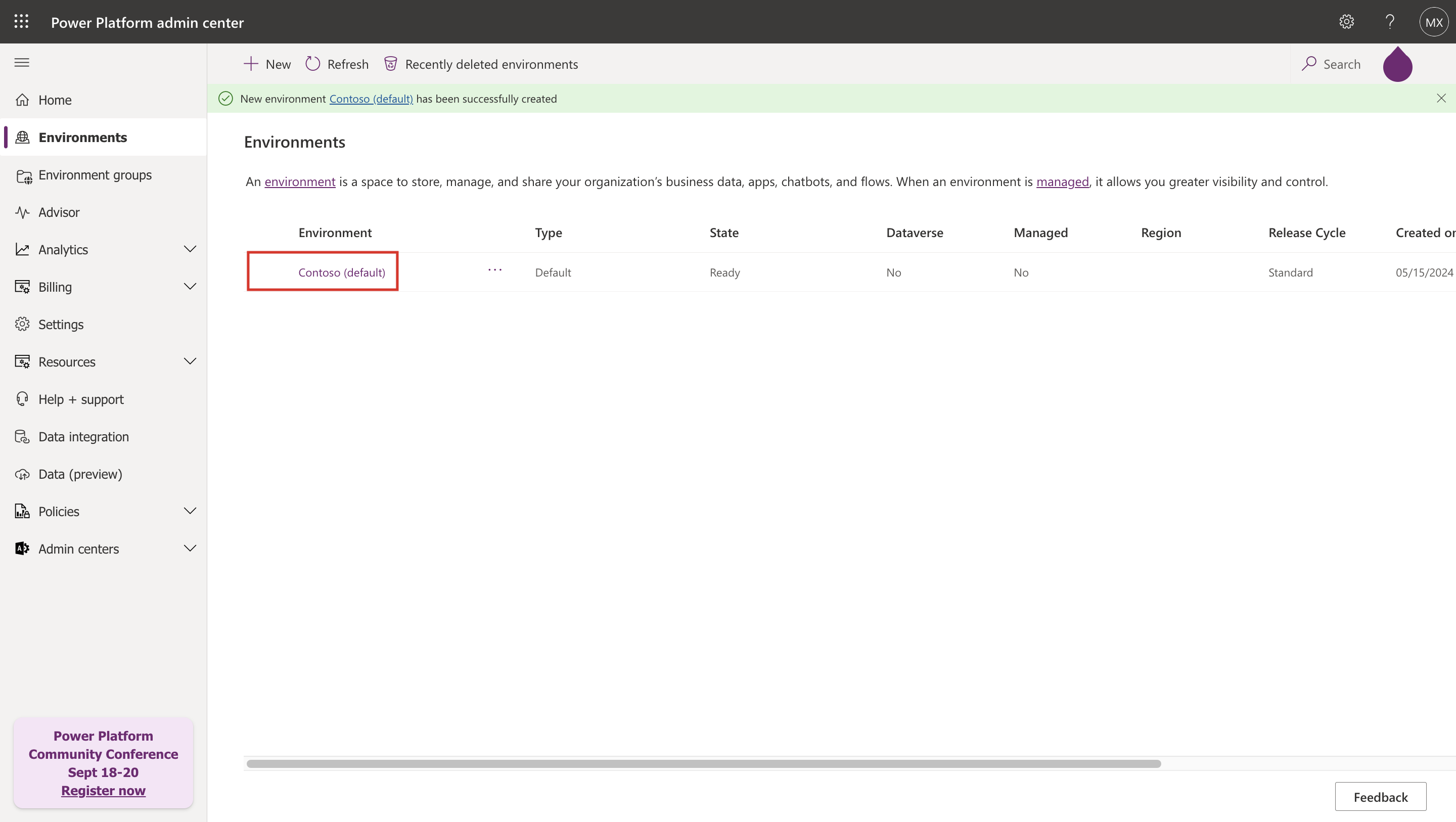 After processing, the environment should show in the Environments list as Ready.