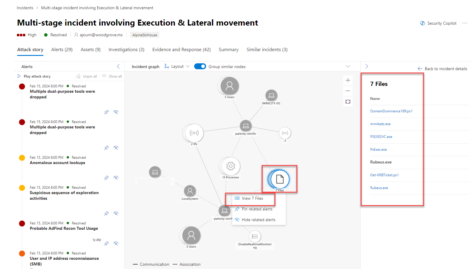 I dette eksempel navigerer du til filer via hændelsesdiagrammet for en hændelse med påvirkede filer. Hændelsesgrafen viser det fulde omfang af angrebet, hvordan angrebet spredte sig gennem dit netværk over tid, hvor det startede, og hvor langt angriberen gik.