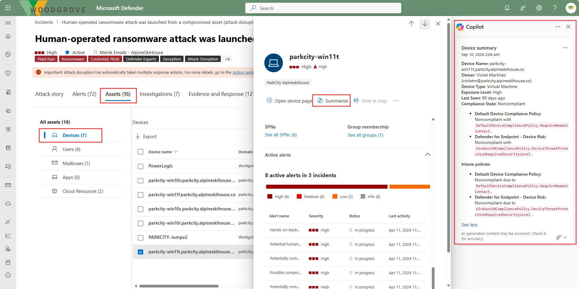 Der er mange måder at få adgang til en enhedsoversigt på. I dette eksempel navigerer du til enhedsoversigten via siden med hændelsesaktiver. Hvis du vælger fanen Assets for en hændelse, vises alle aktiverne. Vælg Enheder i venstre navigationspanel, og vælg derefter et bestemt enhedsnavn. Fra oversigtssiden, der åbnes til højre, kan du vælge Copilot.