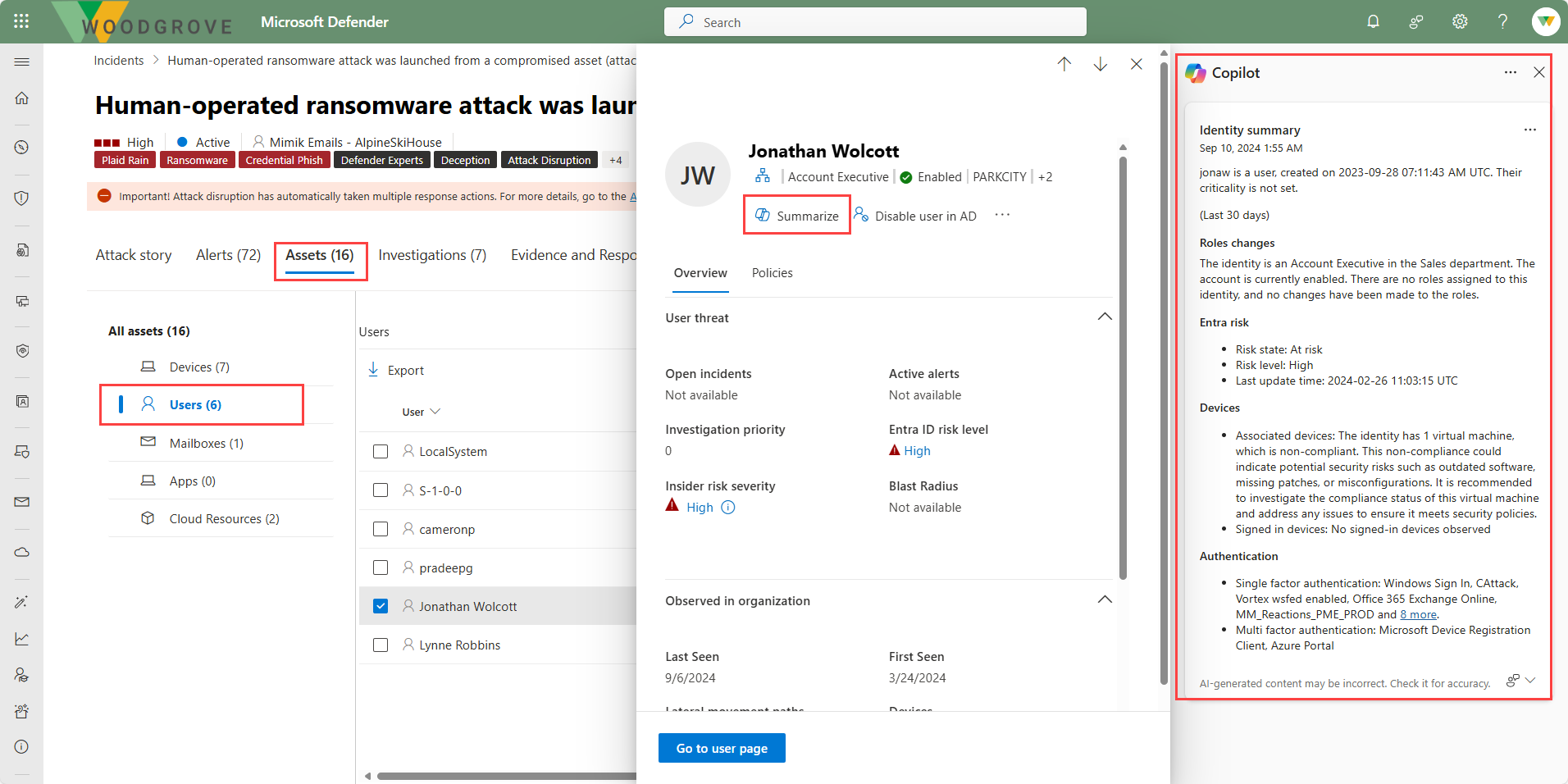 På samme måde kan Copilot i Microsoft Defender XDR opsummere identiteter.