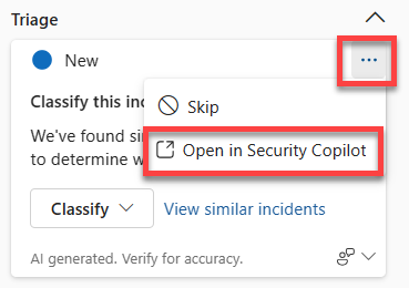 For indhold, der genereres via den integrerede oplevelse, kan du nemt skifte til den separate oplevelse. Hvis du vil flytte til den separate oplevelse, skal du vælge ellipsen i det genererede indholdsvindue og derefter vælge Åbn i Security Copilot.