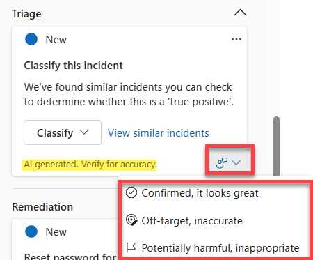 Som med den separate oplevelse giver den integrerede oplevelse brugerne en mekanisme til at give feedback om nøjagtigheden af det AI-genererede svar. For alt ai-genereret indhold kan du vælge feedbackprompten nederst til højre i indholdsvinduet og vælge mellem de tilgængelige indstillinger.