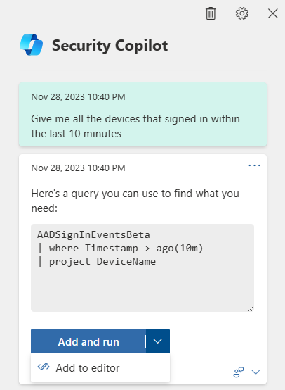Trusselsjægere eller sikkerhedsanalytikere, der endnu ikke er bekendt med eller endnu ikke har lært KQL, kan fremsætte en anmodning eller stille et spørgsmål på et naturligt sprog (f.eks. Få alle beskeder, der involverer brugeradministrator123). Copilot genererer derefter en KQL-forespørgsel, der svarer til anmodningen, ved hjælp af det avancerede jagtdataskema.