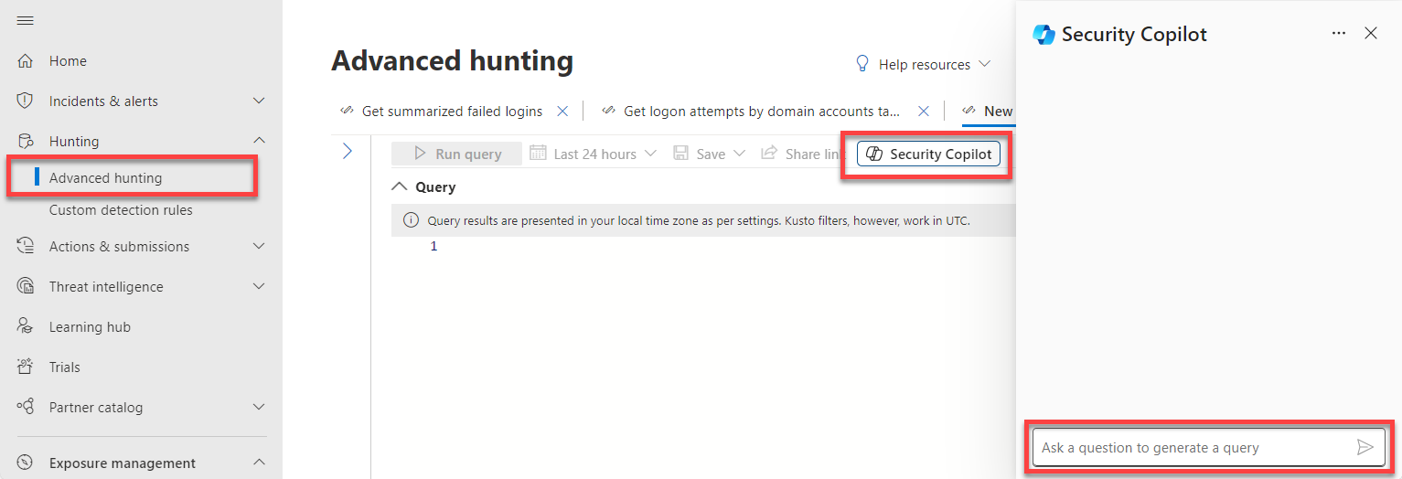 Copilot i Microsoft Defender XDR leveres med en forespørgselsassistentfunktion i avanceret jagt.
