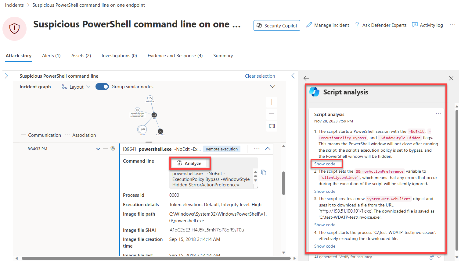 Funktionen til scriptanalyse i Copilot i Microsoft Defender XDR giver sikkerhedsteams ekstra kapacitet til at inspicere scripts og kode uden at bruge eksterne værktøjer. Denne funktion reducerer også kompleksiteten i analysen, minimerer udfordringer og giver sikkerhedsteams mulighed for hurtigt at vurdere og identificere et script som ondsindet eller godartet.