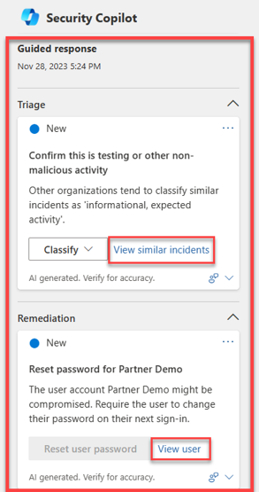 Hvert kort indeholder oplysninger om den anbefalede handling, herunder hvorfor handlingen anbefales, lignende hændelser og meget mere. Handlingen Vis lignende hændelser bliver f.eks. tilgængelig, når der er andre hændelser i organisationen, der ligner den aktuelle hændelse. Teams til svar på hændelser kan også få vist brugeroplysninger for afhjælpningshandlinger, f.eks. nulstilling af adgangskoder.