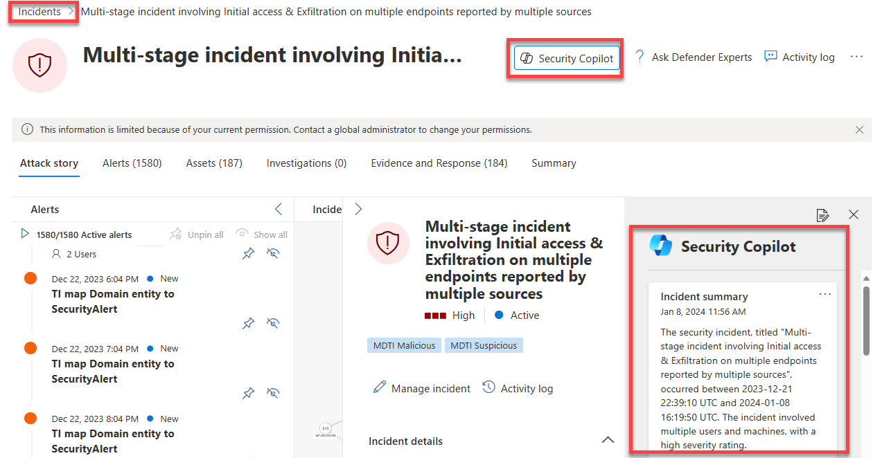 Microsoft Security Copilot er integreret i Microsoft Defender XDR for at gøre det muligt for sikkerhedsteams hurtigt og effektivt at undersøge og reagere på hændelser.